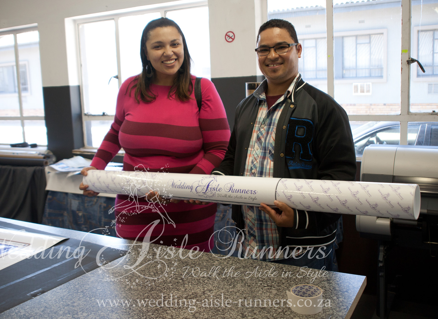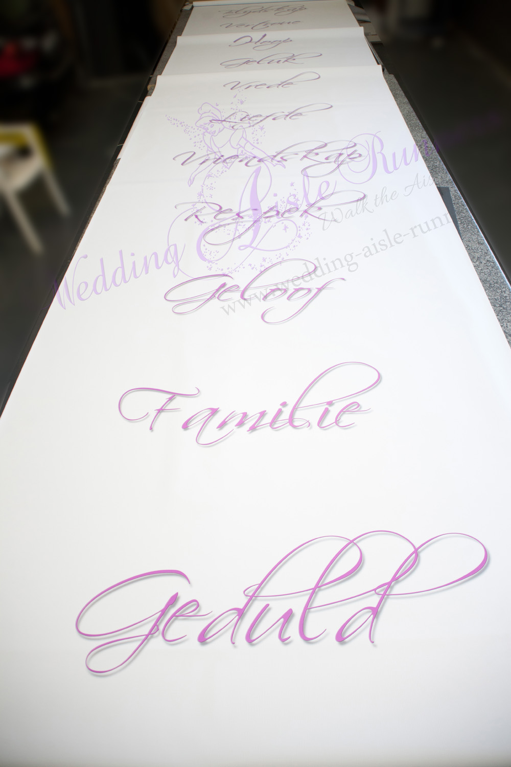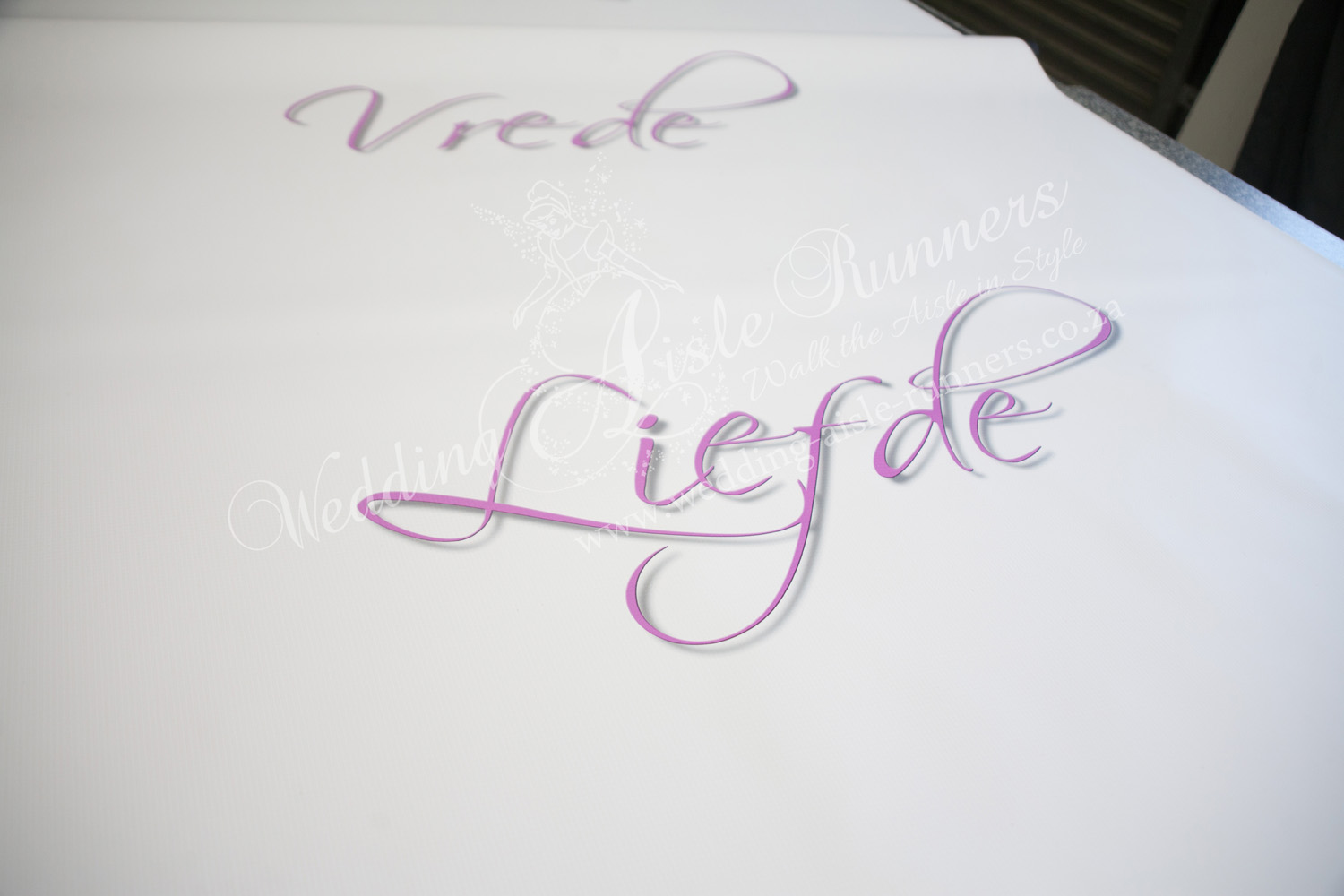 Their colour scheme was shades of pink. You’ll notice that the words start off with an intense pink and gradually fades to a soft pastel pink symbolising the gentleness and wisdom that comes with age. Elton and Joemanian took a leisurely drive to Cape Town to collect their wedding aisle runner at our studio. We look forward to the pics of their wedding day.